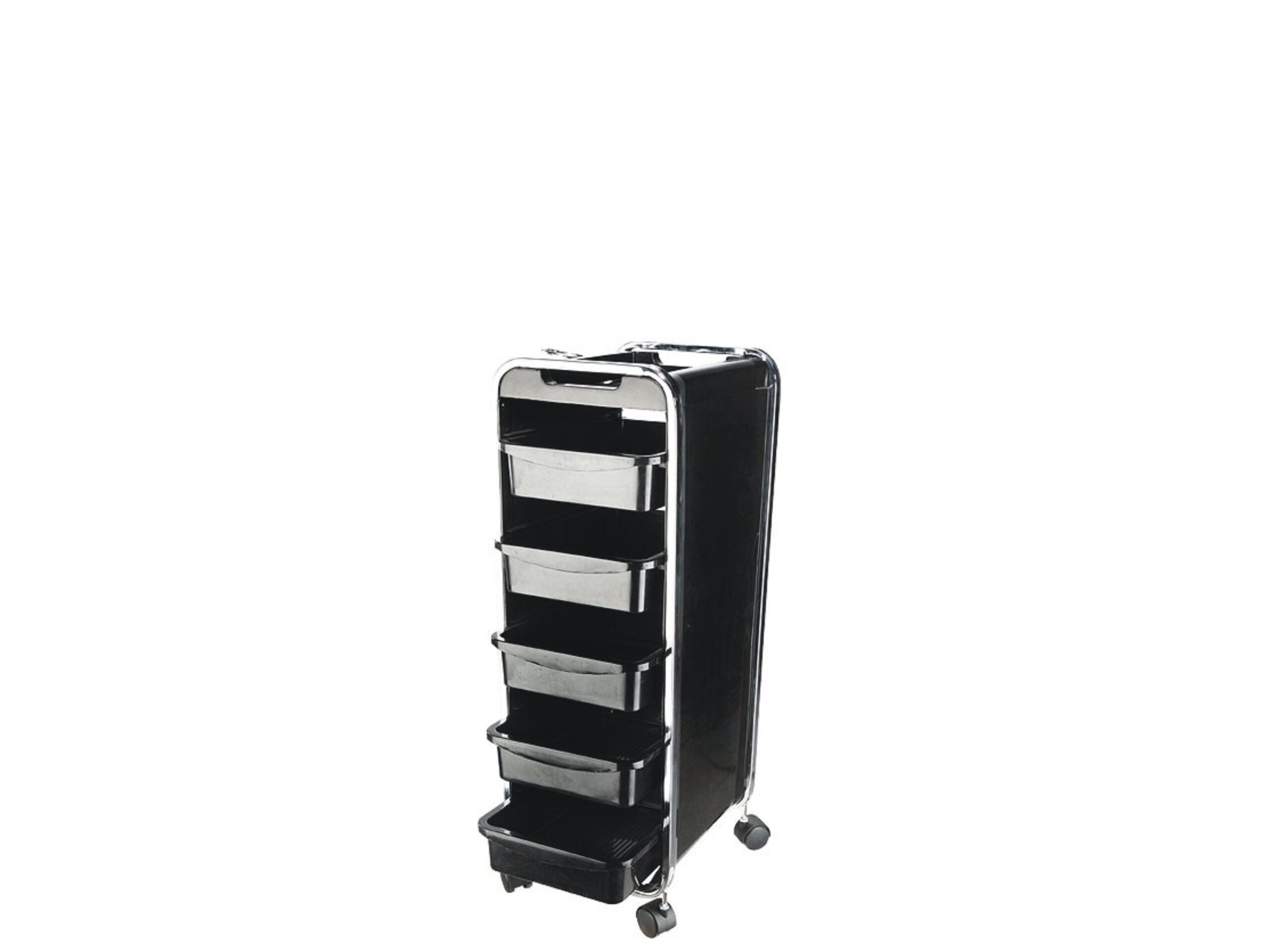 četvrtasta poluotvorena kolica od plastike u crnoj boji, sa 5 fijoka i točkićima. ravna radna površina sa dodacima za četke, četkice
